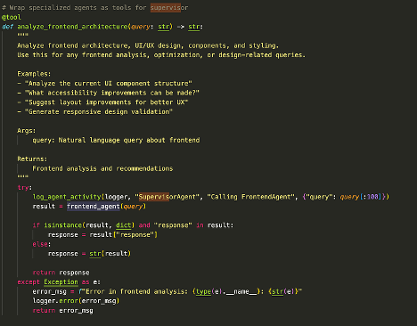 Supervisor agent için bir Frontend araç tanımı aşağıda örneklenmiştir: