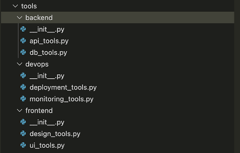 Tools (Araçlar) klasörüne göz attığımızda, her bir agent için birden fazla araç tanımını dikkate alarak aşağıdaki gibi yapılandırılmış bir dizin oluşturmak daha uygun ve kurumsal bir yaklaşım olacaktır.