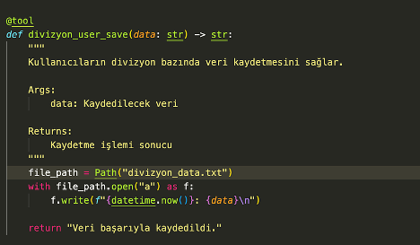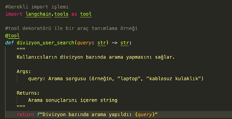 Gerekli paketin kurulmasının ardından, ihtiyaç duyulan temel bileşenleri oluşturmaya başlayabiliriz. Daha önce de belirttiğim gibi, bir yazılım geliştirme sürecinde çoklu agent mimarisi kurgulayacaksak, atomik yapıların ötesine geçmemiz gerekir. Bu nedenle, öncelikle kullanılacak araçları (tool) tanımlamak önemlidir.