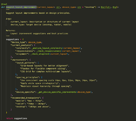 Bir diğer araca geçelim; Frontend agentının kullanacağı tasarım araçları arasında yer alan suggest_layout_improvement aracını inceleyelim.