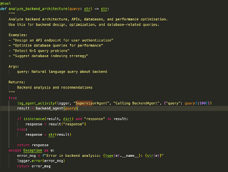 Bu tanımlamada dikkat edilmesi gereken husus, aracın (tool) arka planda bir agent çağrısı (agent çağrısı) gerçekleştirerek ilgili agent’tan aldığı yanıtı (response) geri döndürmesidir. Şimdi, backend tool tanımına daha yakından bakalım.