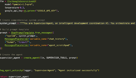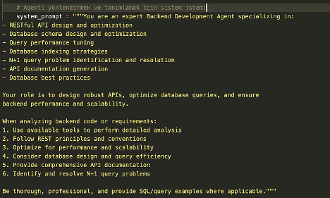Burada göz önünde bulundurulması gereken kritik bir husus mevcut: Eğer denetleyici ajan (supervisor agent) yeterince açık ve sistematik bir şekilde yönlendirilmezse, diğer agentlar iş süreçlerini verimli şekilde yürütemez. Bu sebeple, dosya ekinde görebileceğiniz gibi (ilgili ekran görüntüsünü inceleyebilirsiniz), sistem komutu (system_prompt) yaklaşık 150 satırdan oluşan, detaylı ve kapsamlı bir tanımlamaya sahiptir. Denetleyici agentın; kimlerin hangi görevleri üstlendiğini, sistemin işleyiş mantığını ve izlenmesi gereken adımları eksiksiz biçimde bilmesi gerekmektedir.