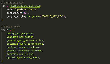 Backend agentına daha yakından baktığımızda, önceki yazıda da ele aldığımız temel bileşenlerle agent’ımızı oluşturduğumuzu görüyoruz. Bu bileşenler; agent’ın operasyonlarında kullanacağı araçlar ile bu araçları etkin şekilde kullanabilmesini sağlayacak Büyük Dil Modeli (LLM) yapılandırmasından oluşmaktadır.
